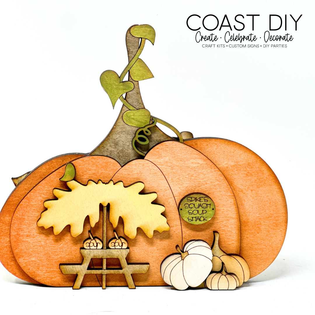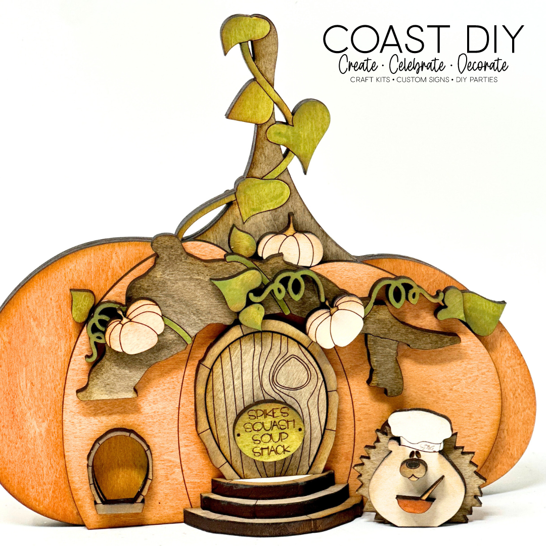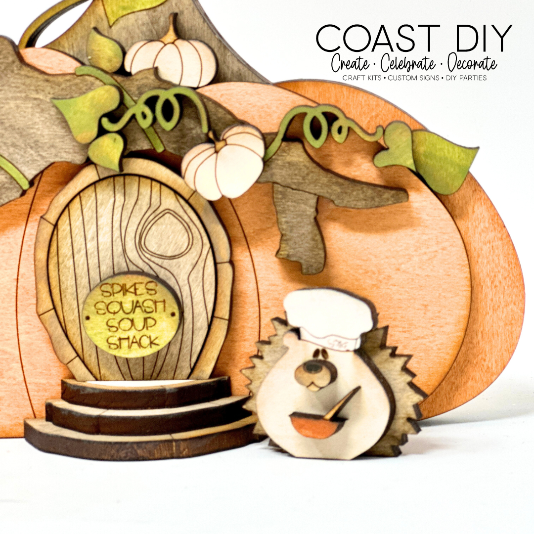 Spike is stirring up some squash soup to serve at his restaurant. With the tree limb overhang over the door and pumpkin vines wrapped all around, the restaurant has a perfect charm for the Autumn Village. Out back is the Leaf Umbrella covered picnic table with two soup bowls ready to go already. This design has some smaller pieces like the little muzzle on spike - consider this when buying if doing this with younger crafters.