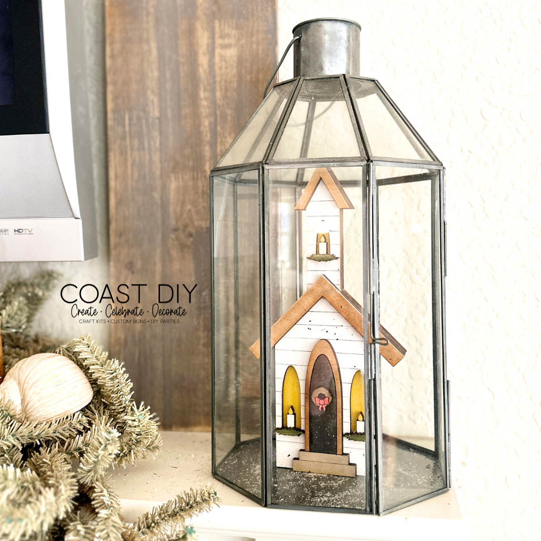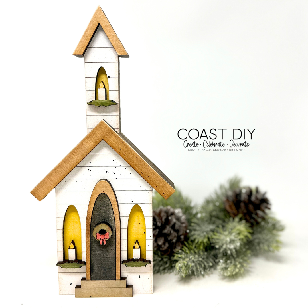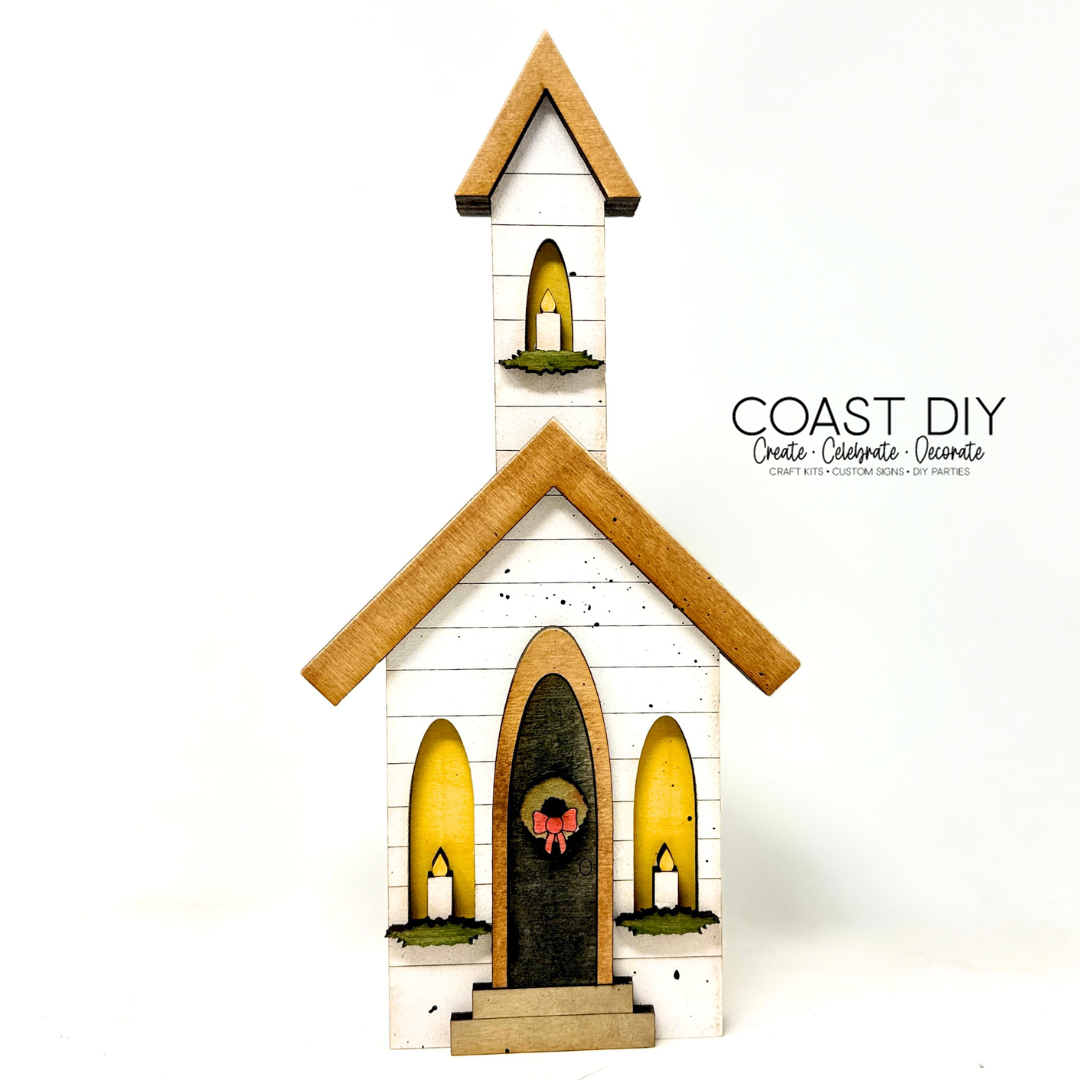 This craft kit is a fun, simple one that creates a 7 layer, shelf-sitter primitive-style church. The design is two-sided (looks the same on both sides) so you can place it on your dining table, a buffet or up on your mantel. The church is 10" tall and 5" wide. The walls are scored to look like planks and have cutouts for the windows giving it a unique, dimensional look. There are candles for the windows and a door with wreath as well. Pair this design with your favorite paint or stain to make it your own.
