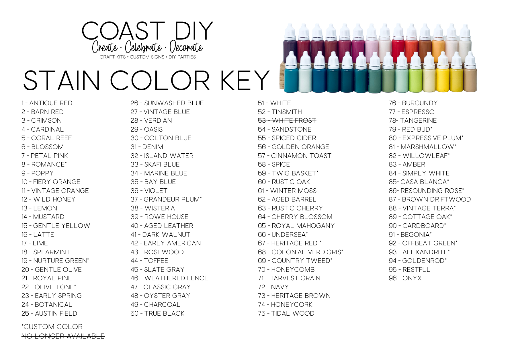 With this listing, you will get a 10mL bottle of every color I have. Currently I have 95 colors and if you look at the photos, you will see the full list of colors you will get. Note, the specific color photos, those are missing some of my newer colors like Tangerine and Heritage Brown. Look at the Stain Color key photo for the complete list. You will get a copy of this stain color key with your order.