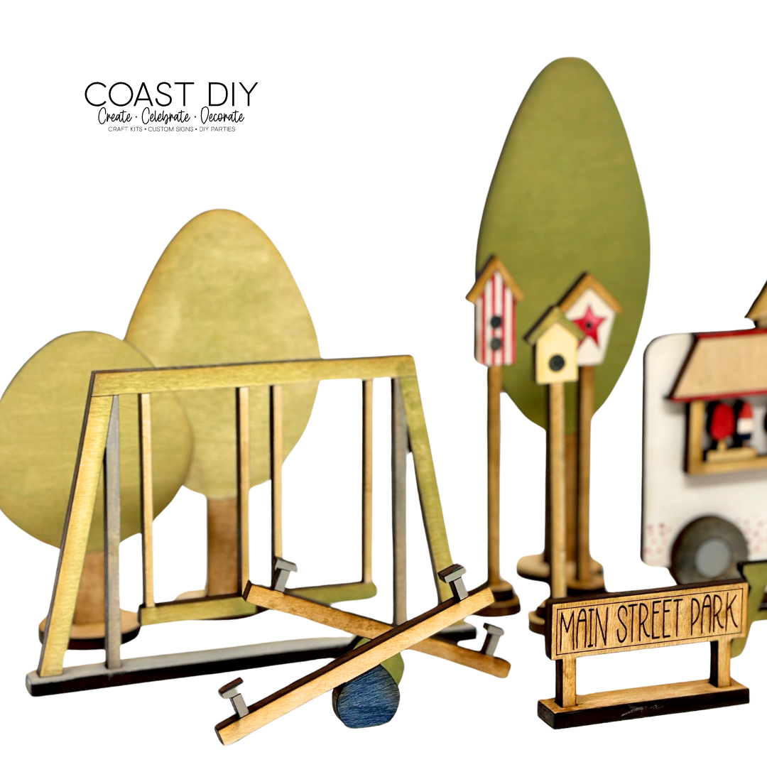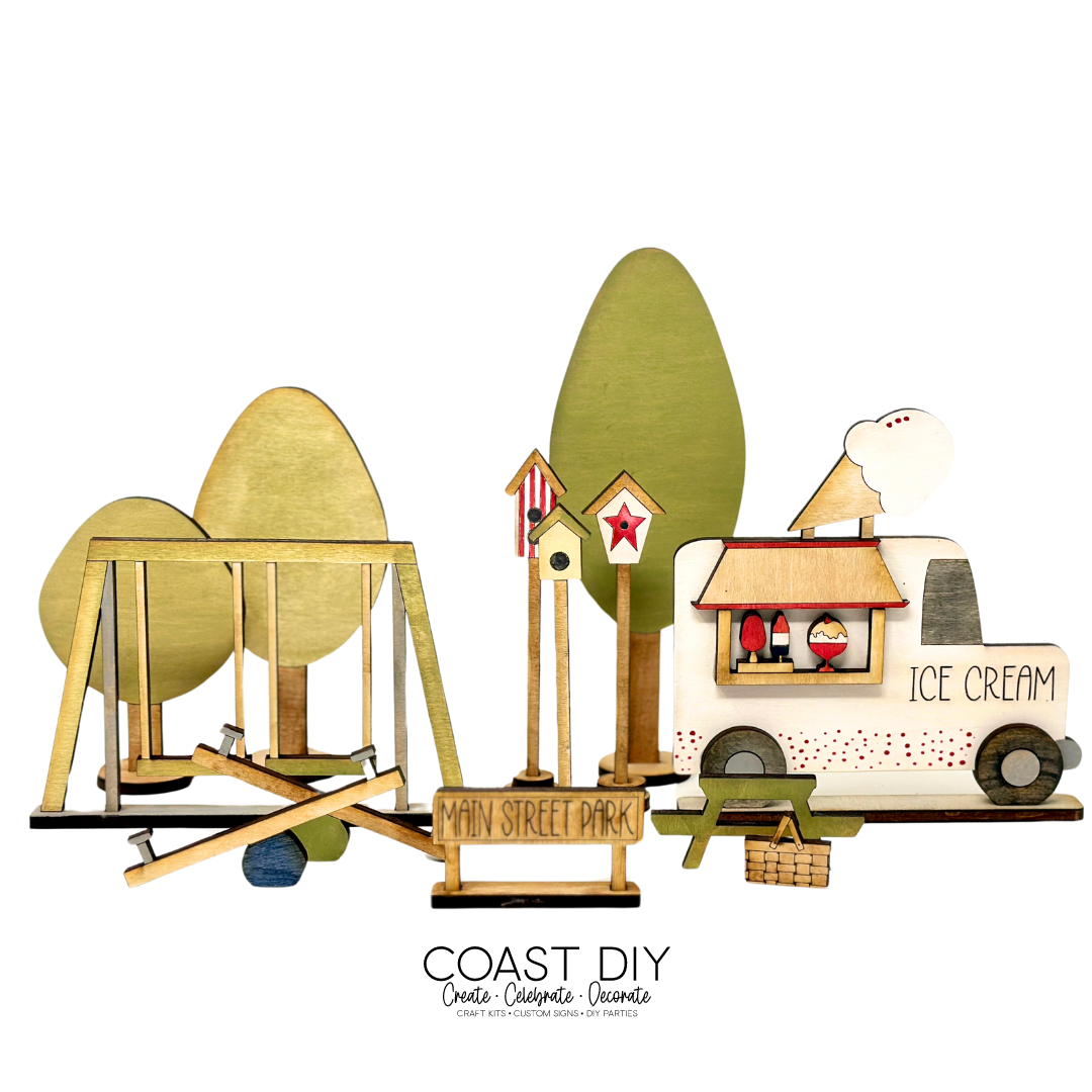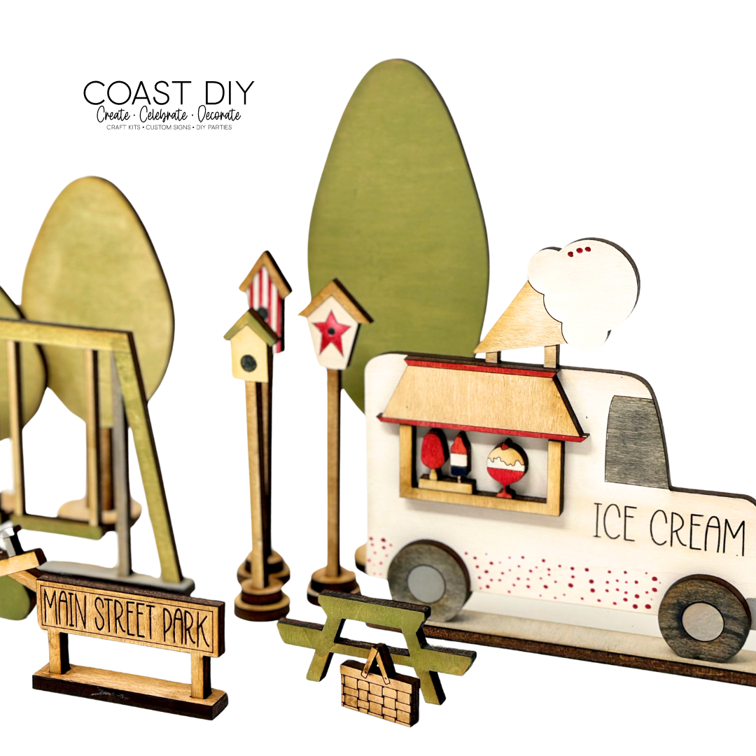 The Main Street Park and Ice Cream Truck is the perfect set of designs to center your Americana Summer Village. It's a fun set with lots of parts so you can have a lot of fun making this kit.