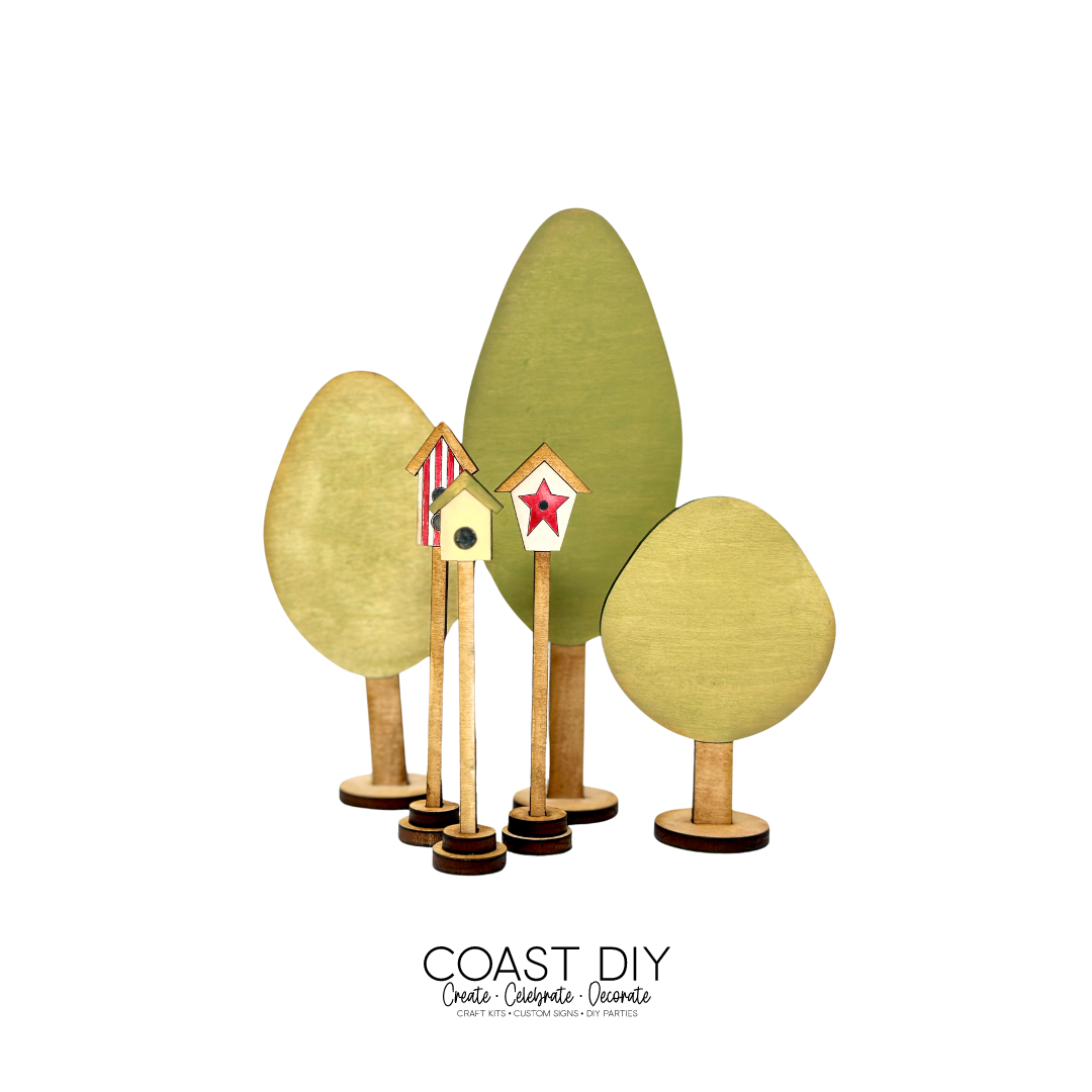 In the park you get the swing set, two see-saws, a picnic table with basket and a park sign. You also get 4 trees (3 shown), 3 different birdhouses and a street lamp (not shown) in the photos. I've shown all the designs together in the photos, but if you are making a village, you can take parts of this kit and sprinkle them throughout the village.