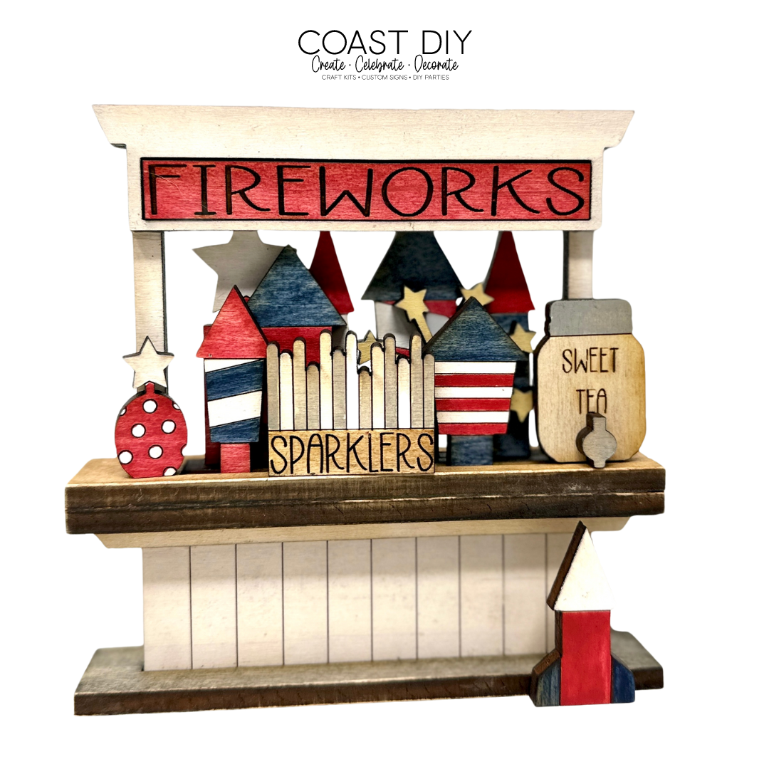 The Interchangeable Market Stand is 5" tall and approx 4.5" wide and is ready for interchangeable parts. You get all the makings for a Fireworks stand, a Lemonade Stand and a Watermelon stand that can take you straight from Spring all the way through Fall. You get a link to a video tutorial showing you how to assemble the booth.