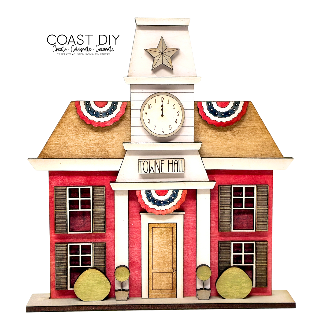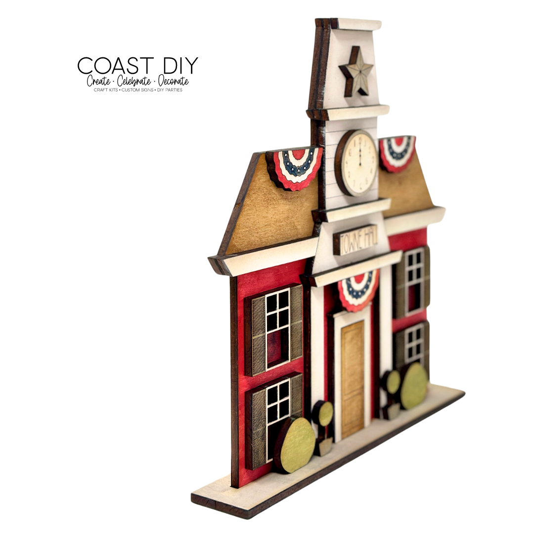 The Towne Hall shelf sitter is 9.6" tall and9" wide and comes with a second layer detail on the front that holds the clock face. This design is one-sided, which is different than my other villages, and includes all the details of the Americana Summer Village like the rectangle front door and windows.