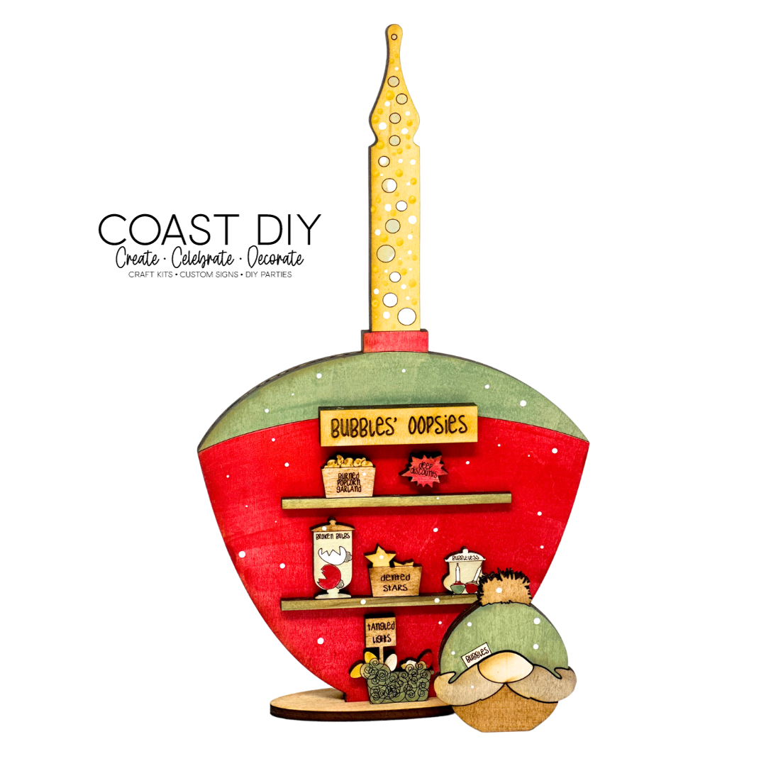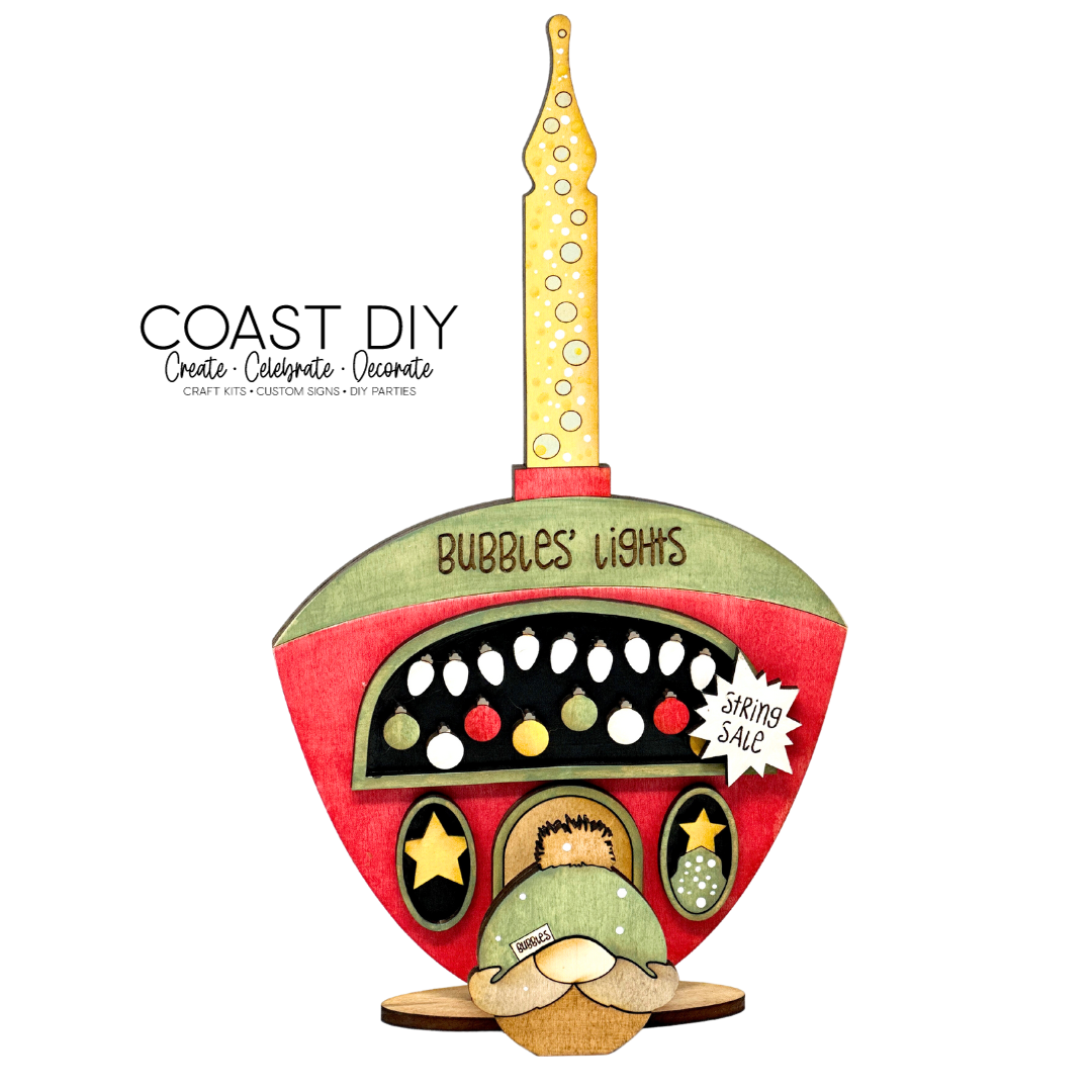 This listing is for the 2023 addition to the Christmas Village series - Bubbles' Lights. This shop is probably the tallest in the village, except maybe the North Pole, at 12.5" tall and 7.2" wide and Bubbles, well he sort of looks like a bubble and stands just under 3" tall.