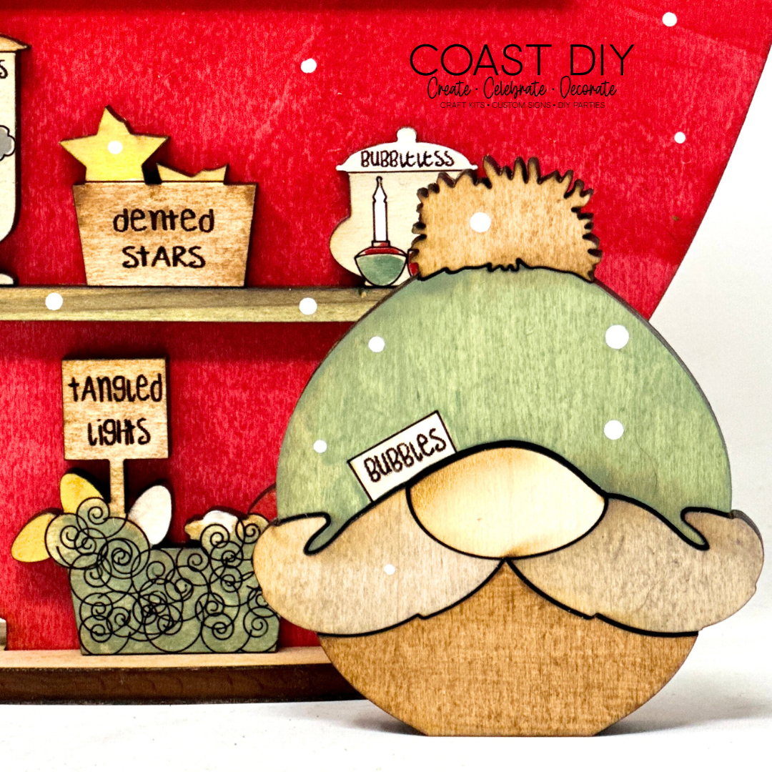 Inside Bubbles' Light Shop you'll find everything you need to get your house all lit up for the holidays. From good old fashion bubble lights to string lights to tree toppers to even popcorn garland for your tree. But, Bubbles has never been known for being graceful and around back you can find some great bargains! Here you will find some bubble lights that are bubble less, some dented stars and broken bulbs. There is a big container of tangled lights for sale and even a tub of burnt popcorn garland that Bubbles left in the microwave too long.