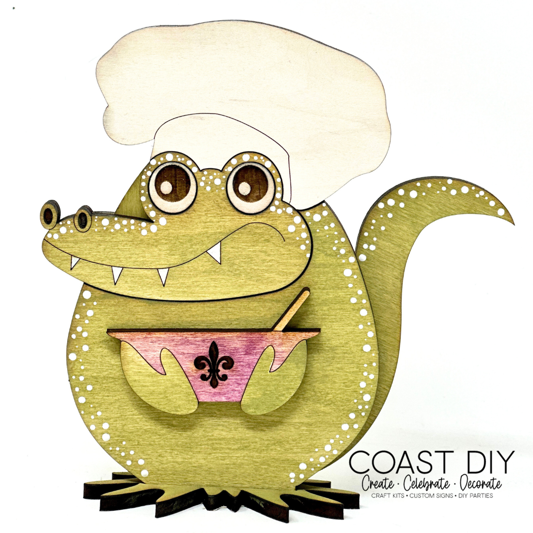 The Gator Chef holds a bowl with a fleur-de-lis on it and stands 6.3" tall and 4.6" wide (plus a little more with the tail) and is two sided with a foot shaped stand. You can get a lot of fun texture with dots with this cute design and the eyes are engraved.