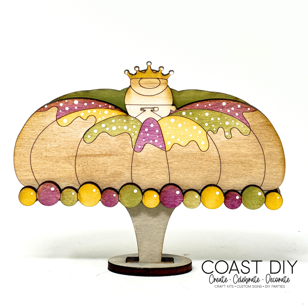 The King Cake has a baby with a crown sitting right on top in the middle. The cake is two sided as well so you can display on your table or buffet. The cake is 4.4" tall and 6.4" wide.