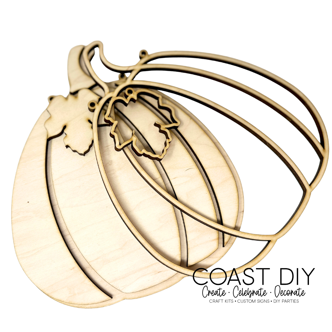 This is a wood only kit with three design options that you can use to paint or to create a Faux Stained Glass design or paint. The pumpkin is 8" tall and 6.7" wide with 2 holes to hang and comes with a leaf. The wood is 0.20" thick and made of premium maple plywood which is great for staining and the thickness is great for a resin stained glass project.