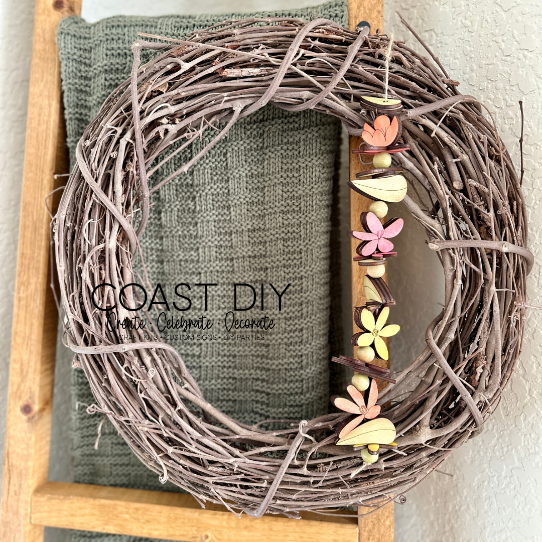 This kit has over 40 floral "beads" and multiple styles and sizes in those beads. You will get flat beads that are single layers with a simple hole in them as well as layered beads that require wood glue to build but give you a front facing view of the design. The layered beads are three layers with a solid layer on each side and a split layer in the middle to allow the twine/ribbon to be threaded through. You will get multiple flower shapes and a leaf as well as wooden round beads to accent the designs you make. See photos for clarity on bead types.