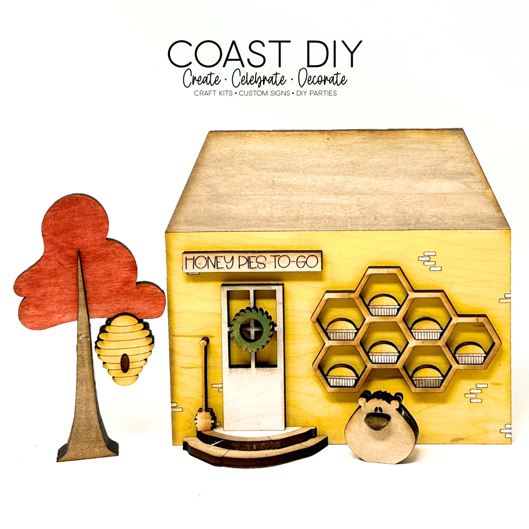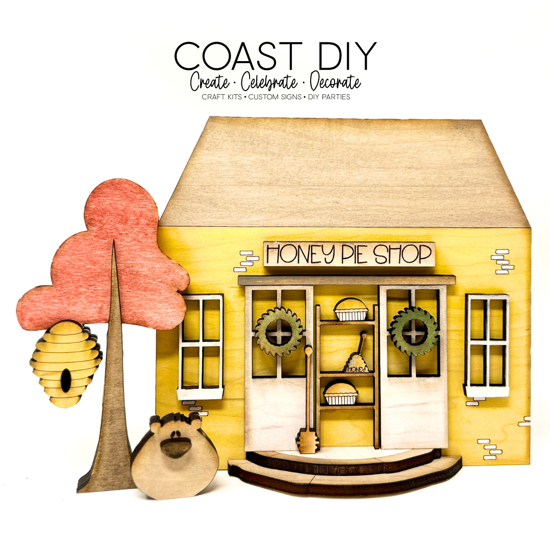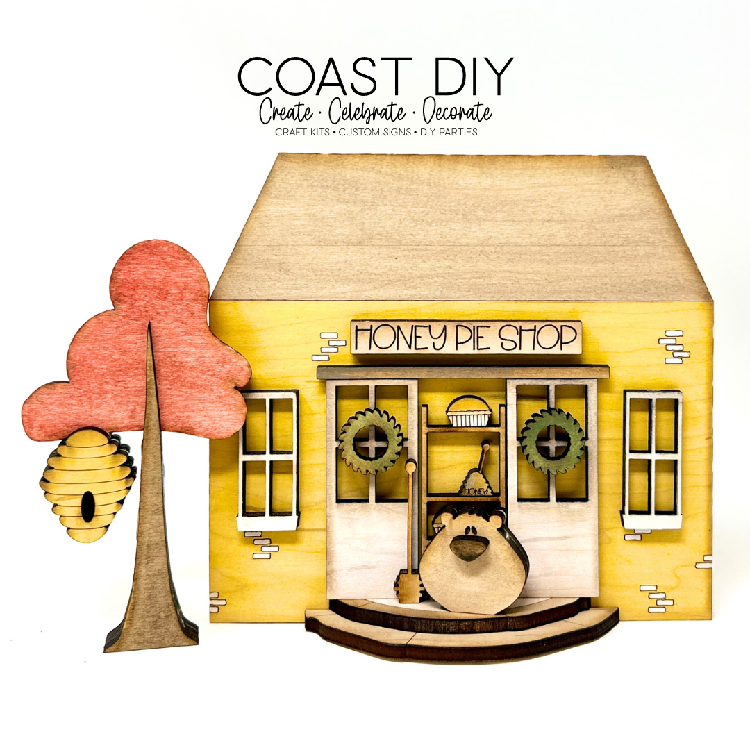 The Honey Pie Shop is run by the cute bear out front and sourced by the hive that you can find hanging in the tree you get. Lots of goodies on the shelves just inside the front door. And out back, you can pick up a takeout pie inside the honeycomb shaped shelves.