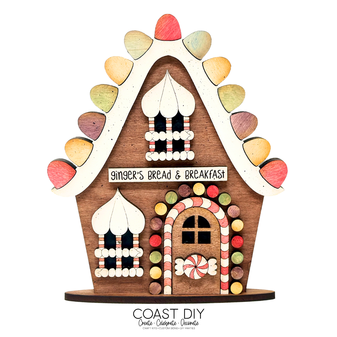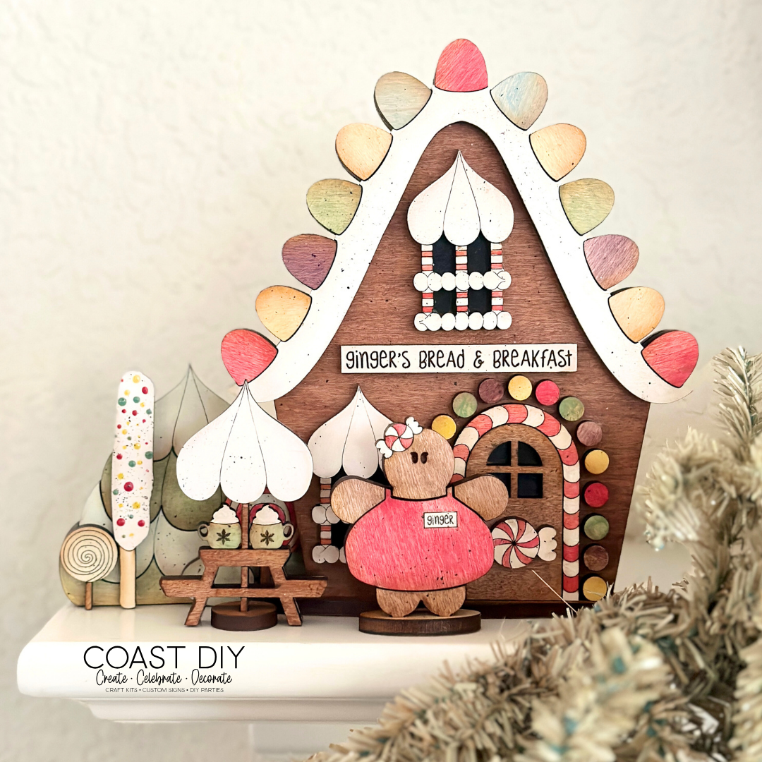 With all the details, I am extremely proud of this design and think it is a precious addition to the Coast DIY Christmas Village. Ginger's Bread and Breakfast is, of course, my version of a Gingerbread House complete with a gumdrop and frosting roof, meringue and peppermint stick windows, a gingerbread door and a peppermint doorframe which is surrounded by chocolate candies. This design has 4 layers and the final piece is approx 8x6.6". Ginger is 2.7" tall and the meringue tree is 3.5" tall.