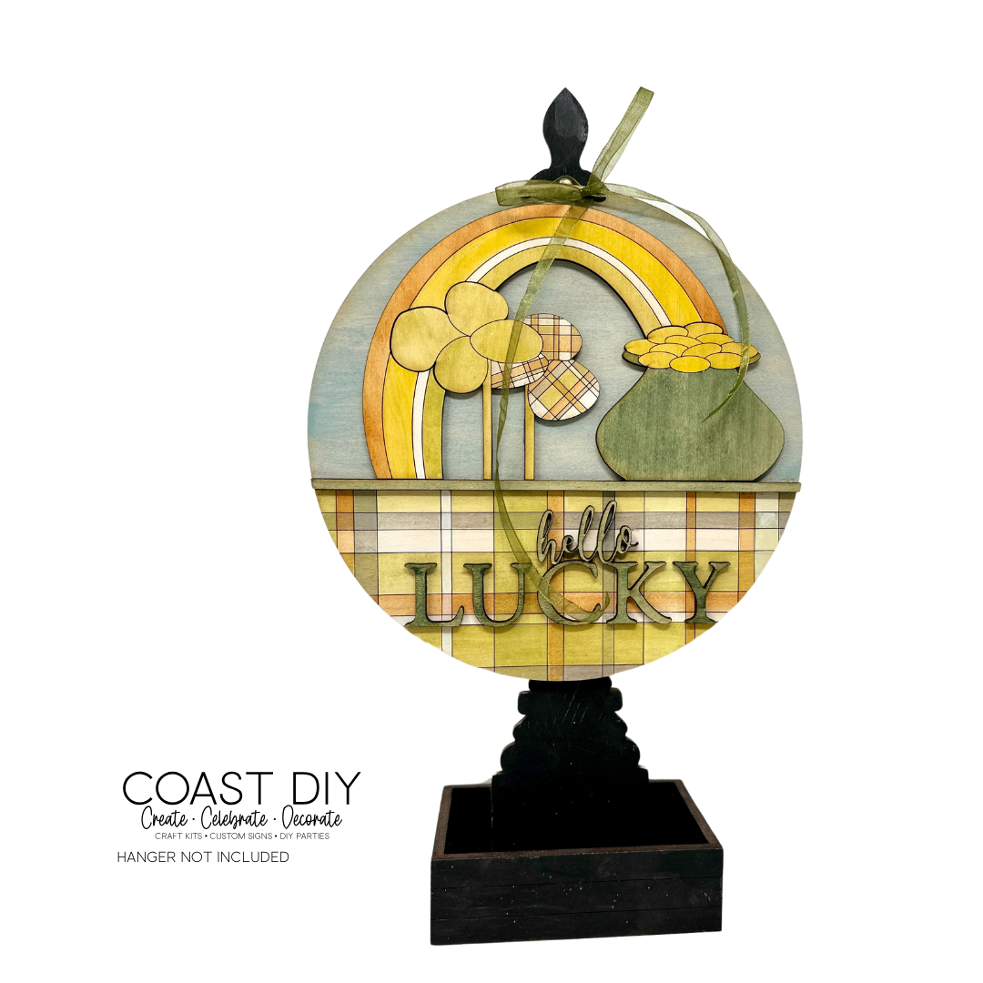 This is a 9", two layer sign with stain kit. You get the two layer sign with the rainbow into a pot of gold with the clovers. The kit is on 1/8" maple plywood and included the following stains: vintage blue, amber, mustard, marshmallow, Austin field green, willow leaf and wild honey. You'll get a small pot of my favorite wood glue and two brushes as well making this a complete kit. Perfect for a paint party, gift or quiet night in front of a good movie.