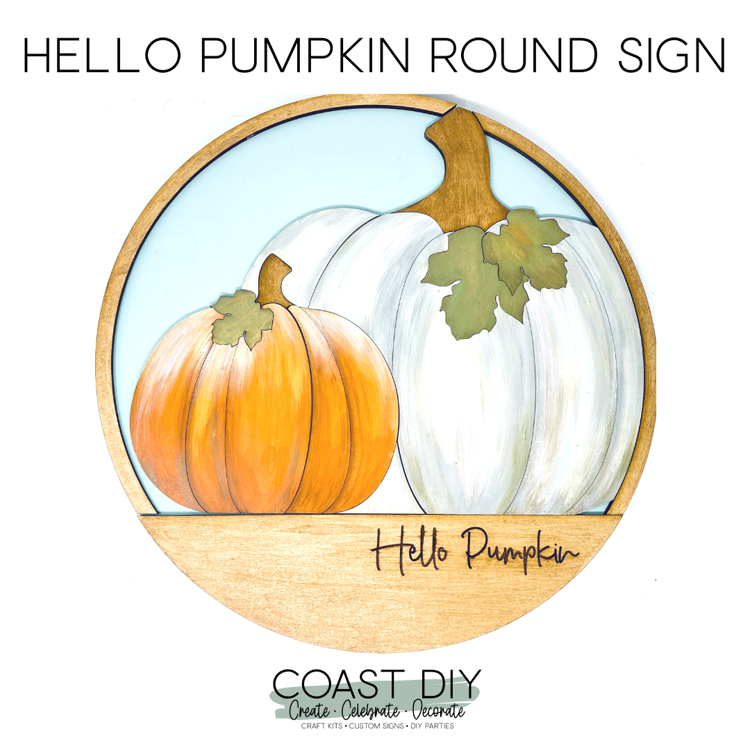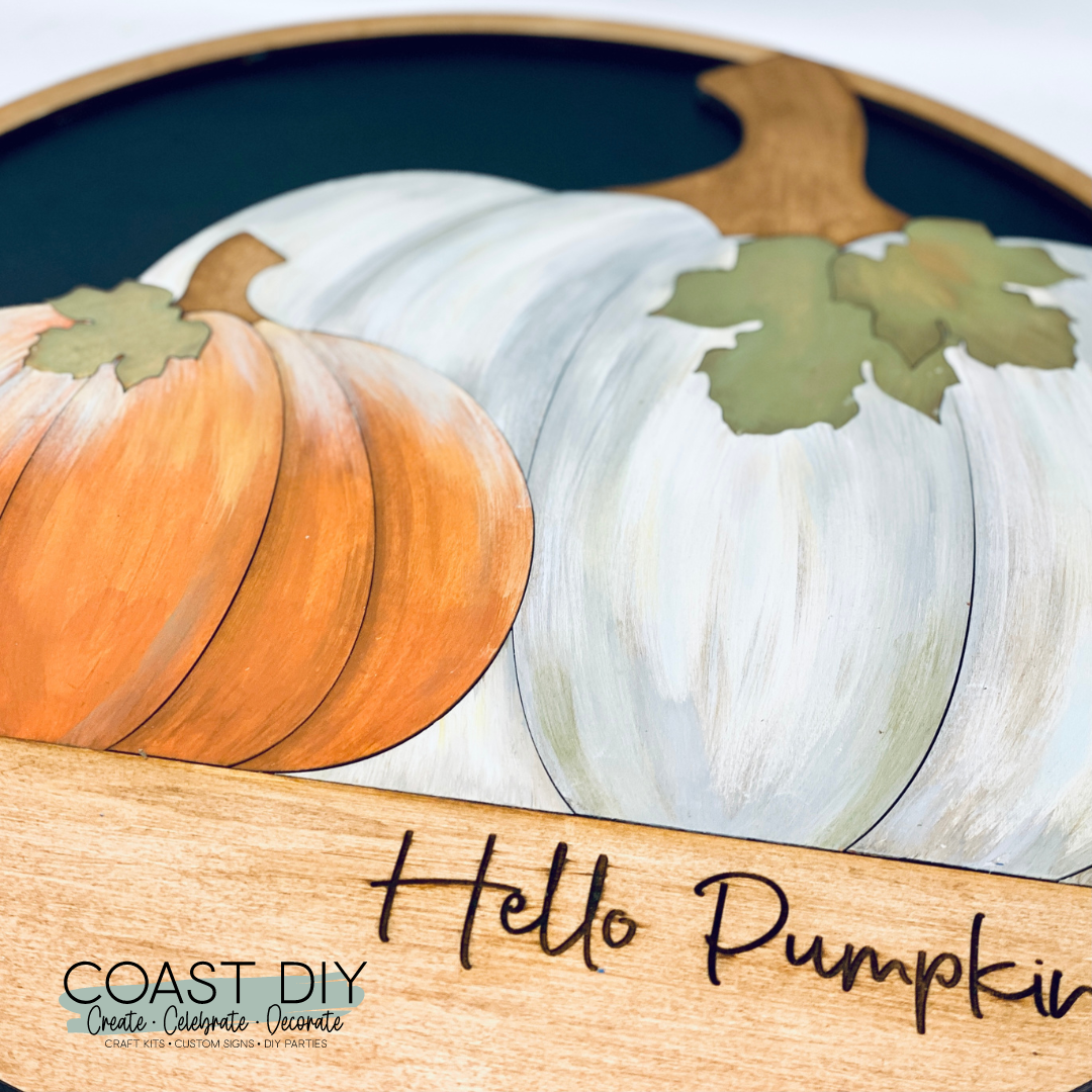 This listing has three options: 1. a full kit black background, 2. a full kit blue background and 3. a wood overly option (if you already have an 18" round you can use). The round sign is 18" and comes with a very large overlay design that includes a frame, engraved base that says 'Hello Pumpkin' and two very large pumpkins. I will have a video on the Facebook page teaching this new staining technique and your kit will have a QR code if you choose the full kit.