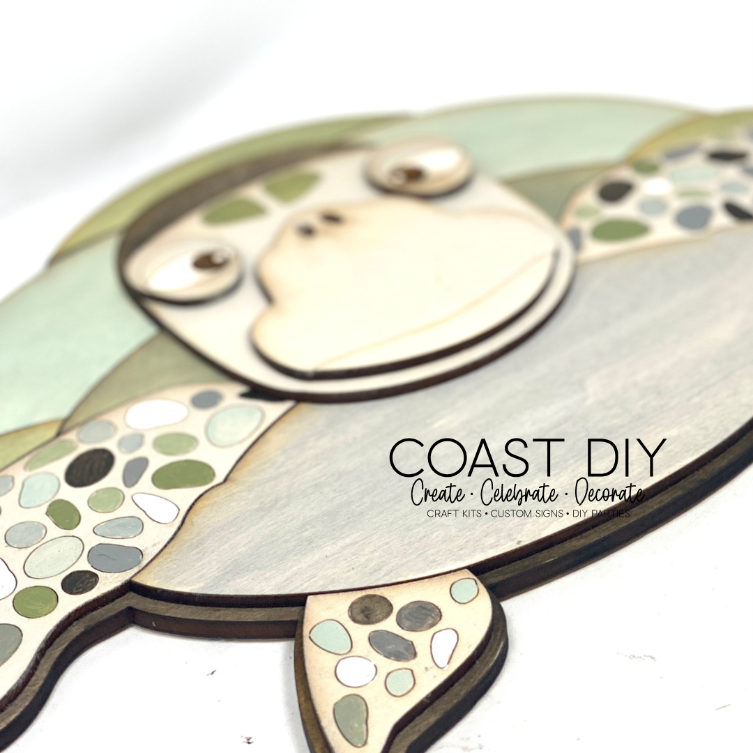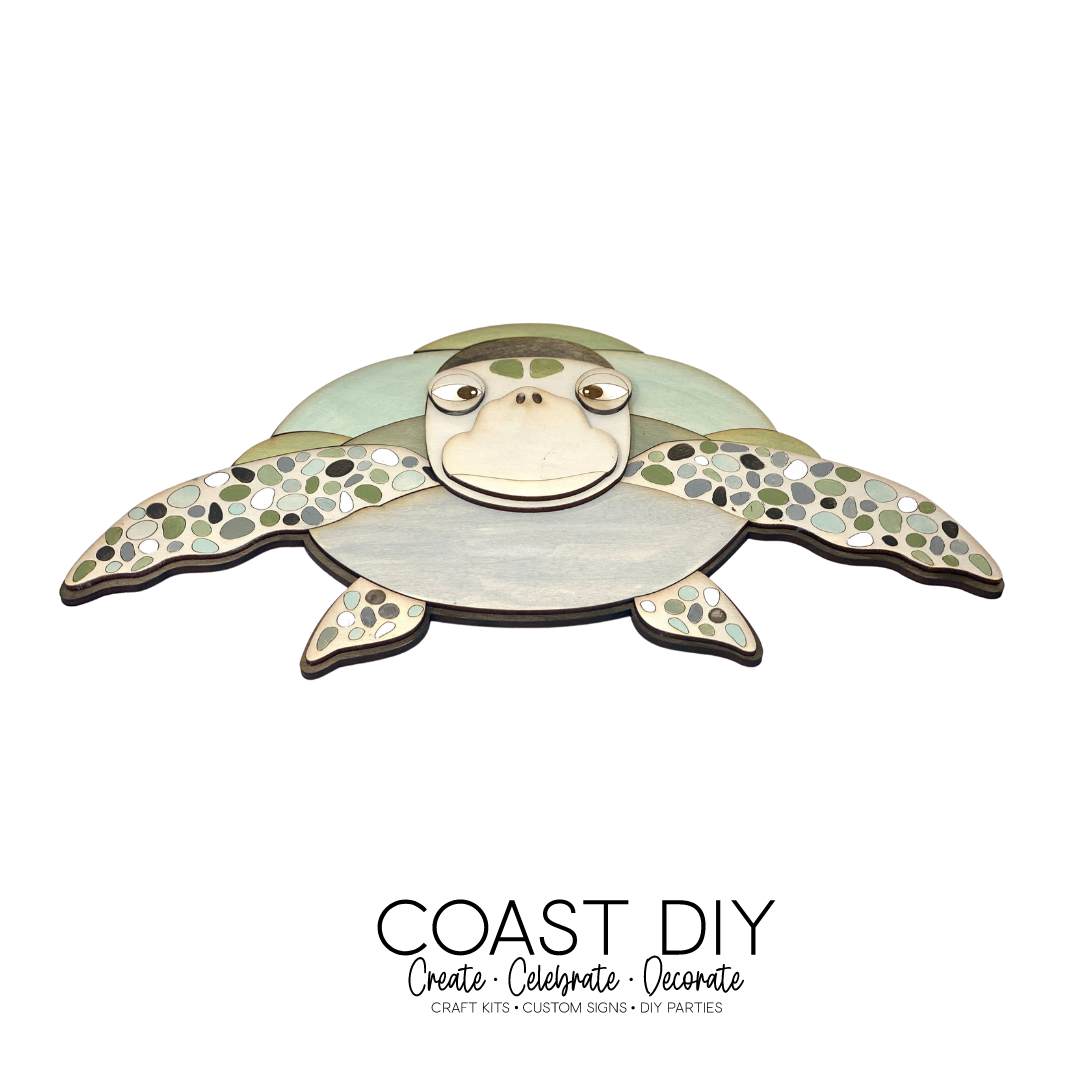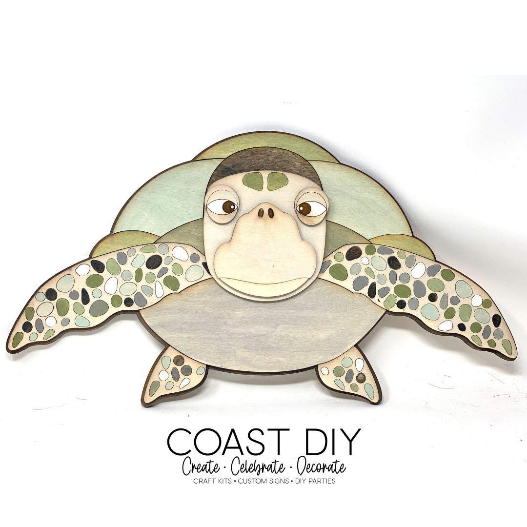 This design is a 4 layer sea turtle that comes with a solid back piece and a three layer turtle. The design is cut to make it easy to paint and the fins and facial features are scored. The kit comes with command strips you can use to hang it. It is perfect for any spot on the wall and even for your kitchen backsplash. This is a large layered design that is 17.5" wide and 9.5" tall.