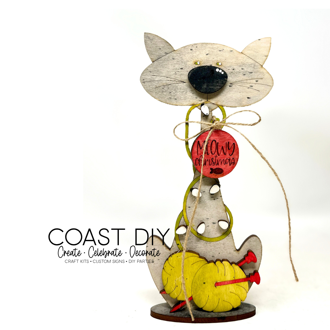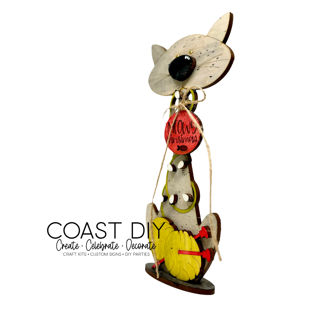 This cute 9.4"x4.5" tall cat looks a little like a tree all wrapped up in yarn and lights and holding an ornament in its mouth. Pair this kit with your favorite paint or stain.