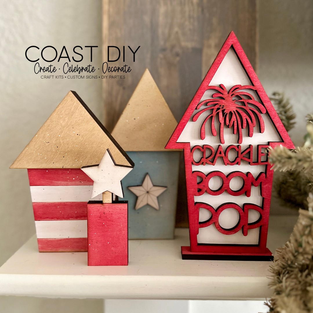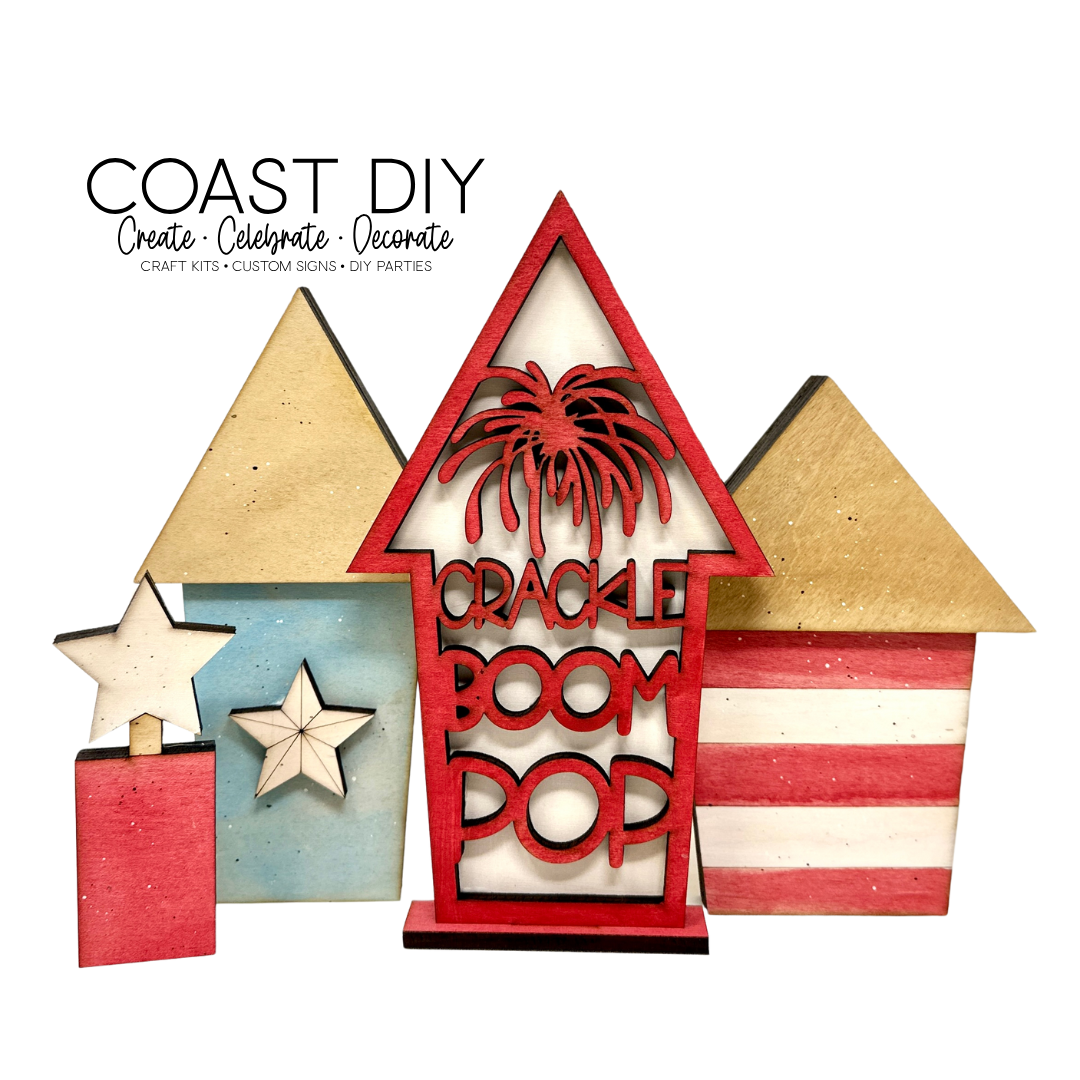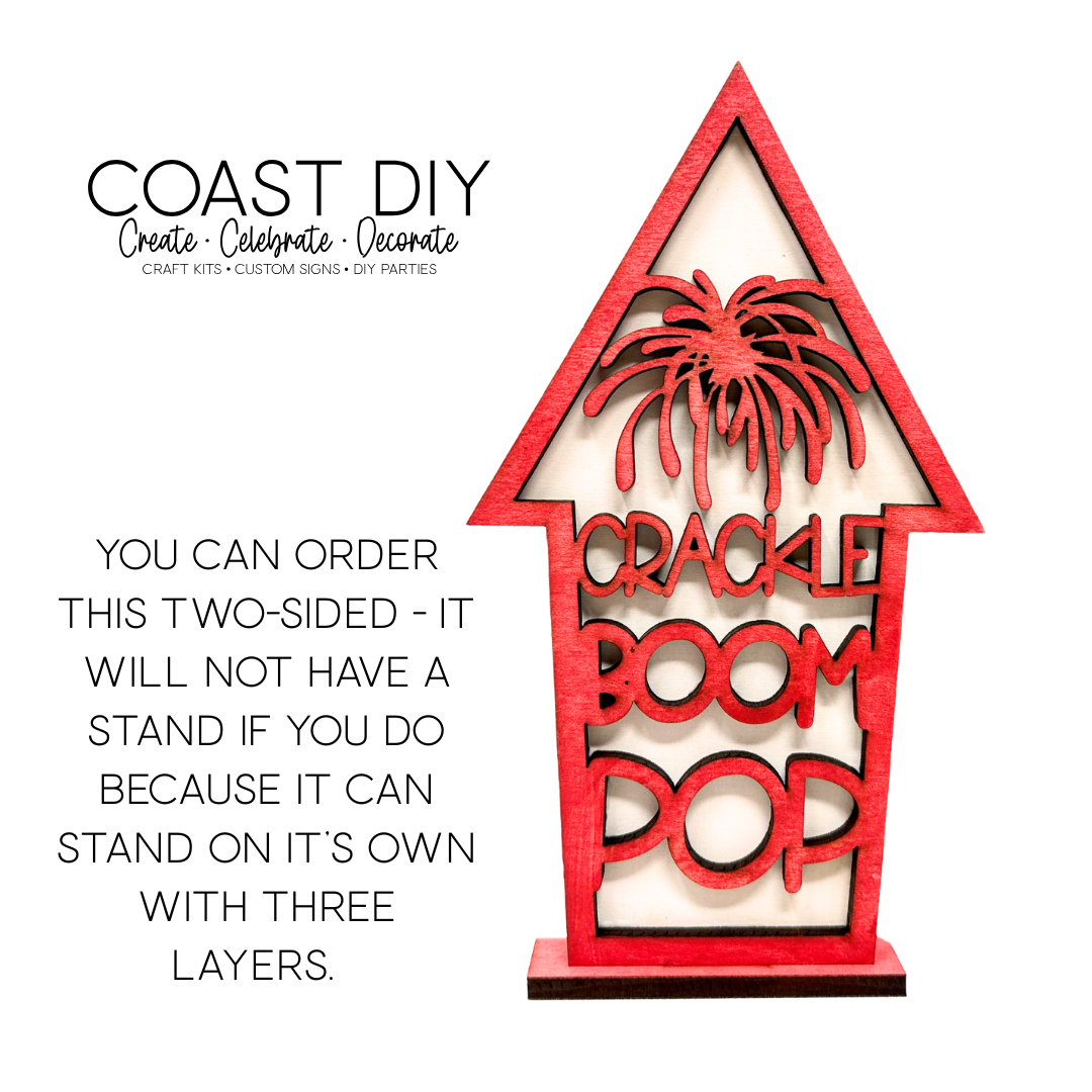 When choosing, you can choose to have the "Crackle, Boom, Pop" firework be one-sided or two-sided. If you choose one-sided (as shown), it will come with a stand to make sure it stands up. If you choose two-sided, that extra side will be enough stability for it to stand on its own, so it will not need a stand. Choose the two-sided for a table decor item down the center, or choose the on-sided for a shelf or mantel.