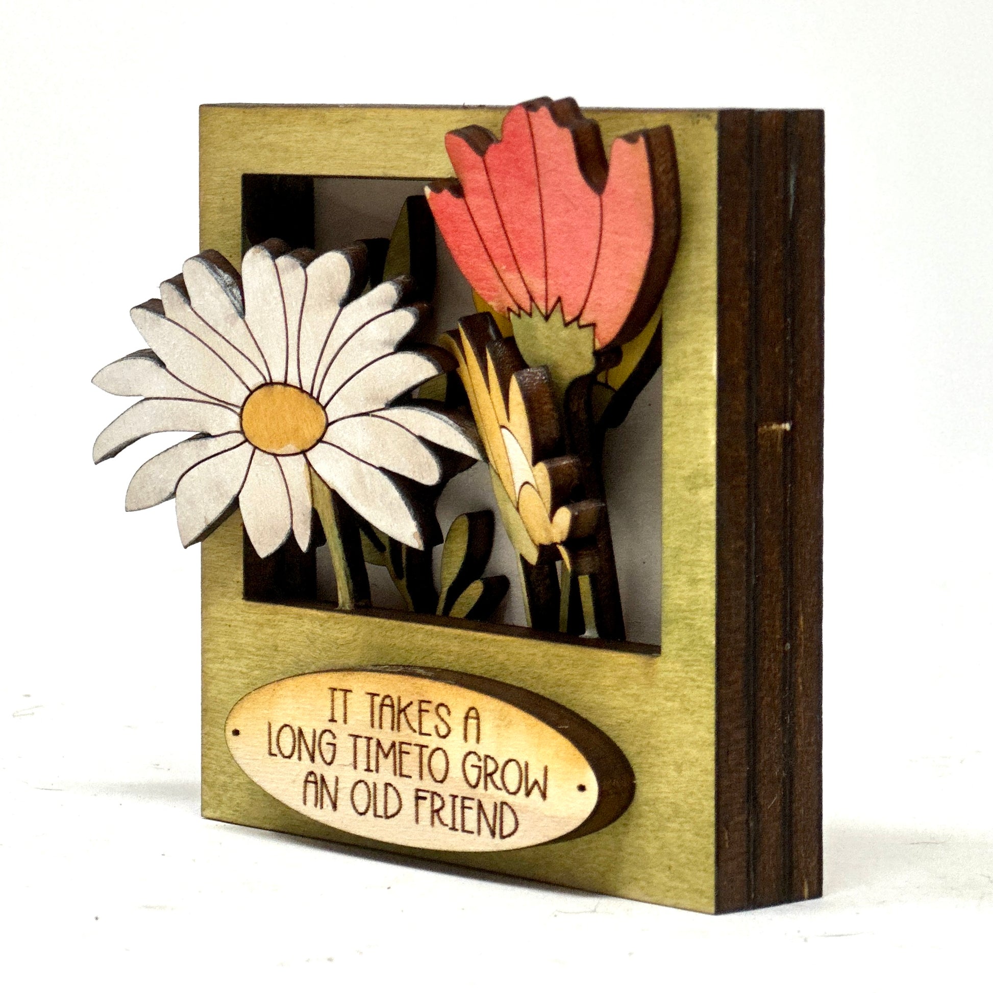 This cute frame is three layers and comes with 4 flowers and a piece of greenery to arrange as you like inside (and poking out of) the frame. You also get a plaque with the saying "It takes a long time to grow an old friend." The frame is 3"x3" and .6" thick. I've done a video tutorial you can watch.