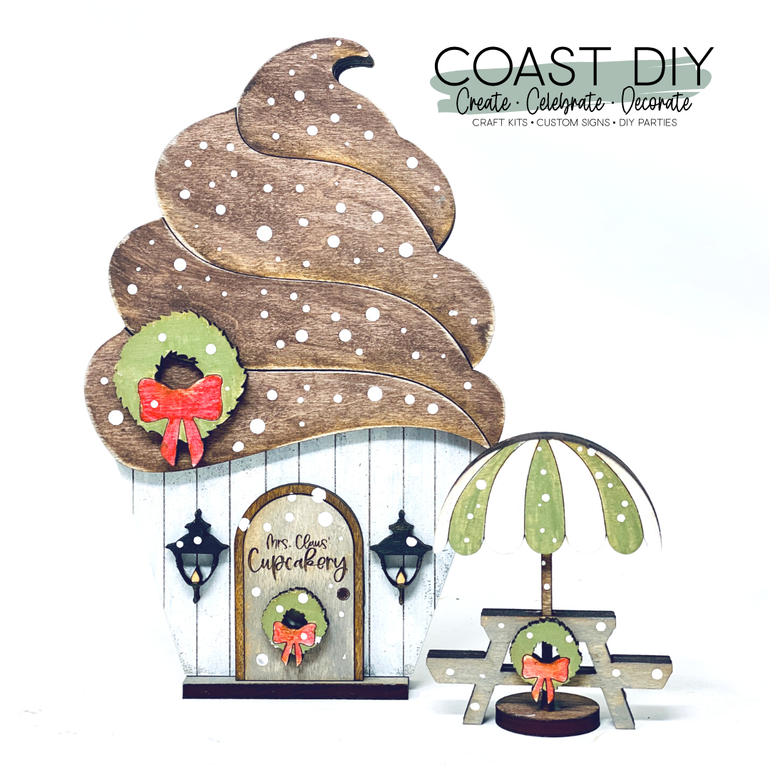 The cupcakery is in the shape of a cupcake and the base looks like shiplap which make it perfect for the building. You can see Mrs. Claus baking with her sprinkles in the back window and you also get a freestanding picnic table. There are several cupcakes and wreaths for options.