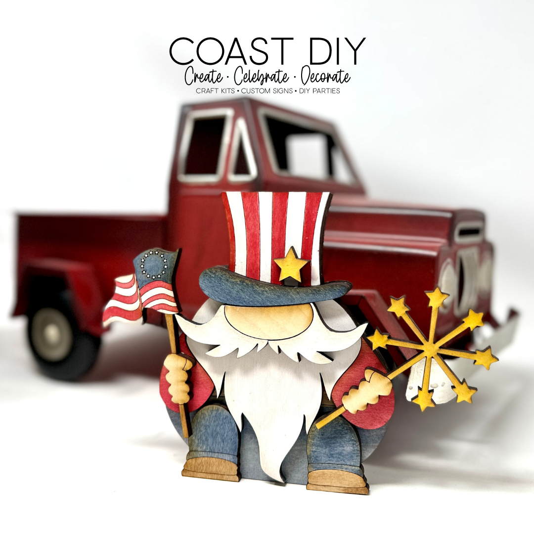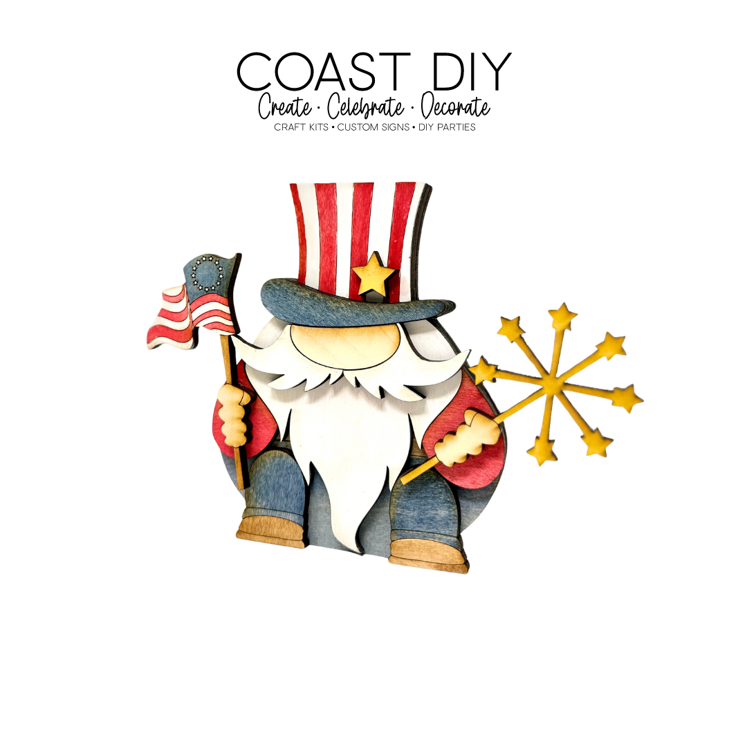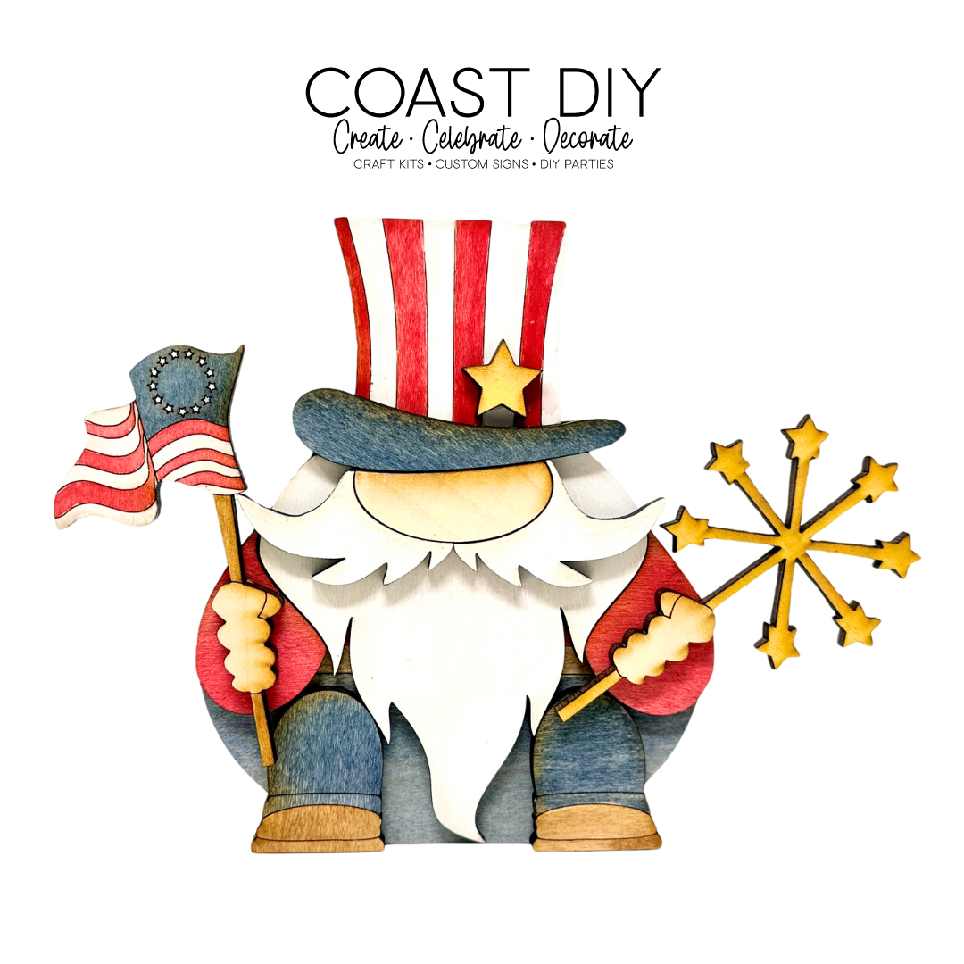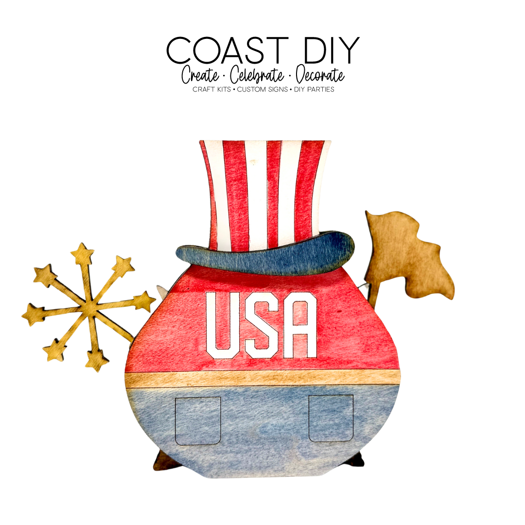 Uncle Sam is sitting on the curb, holding his flag and sparkler, watching the 4th of July parade. He is rocking his USA sweatshirt, jeans and his typical hat. He comes without paint/stain but you can pair him with any paints. Or consider the Americana Stain set. He sits 6.1" tall and 5" wide.