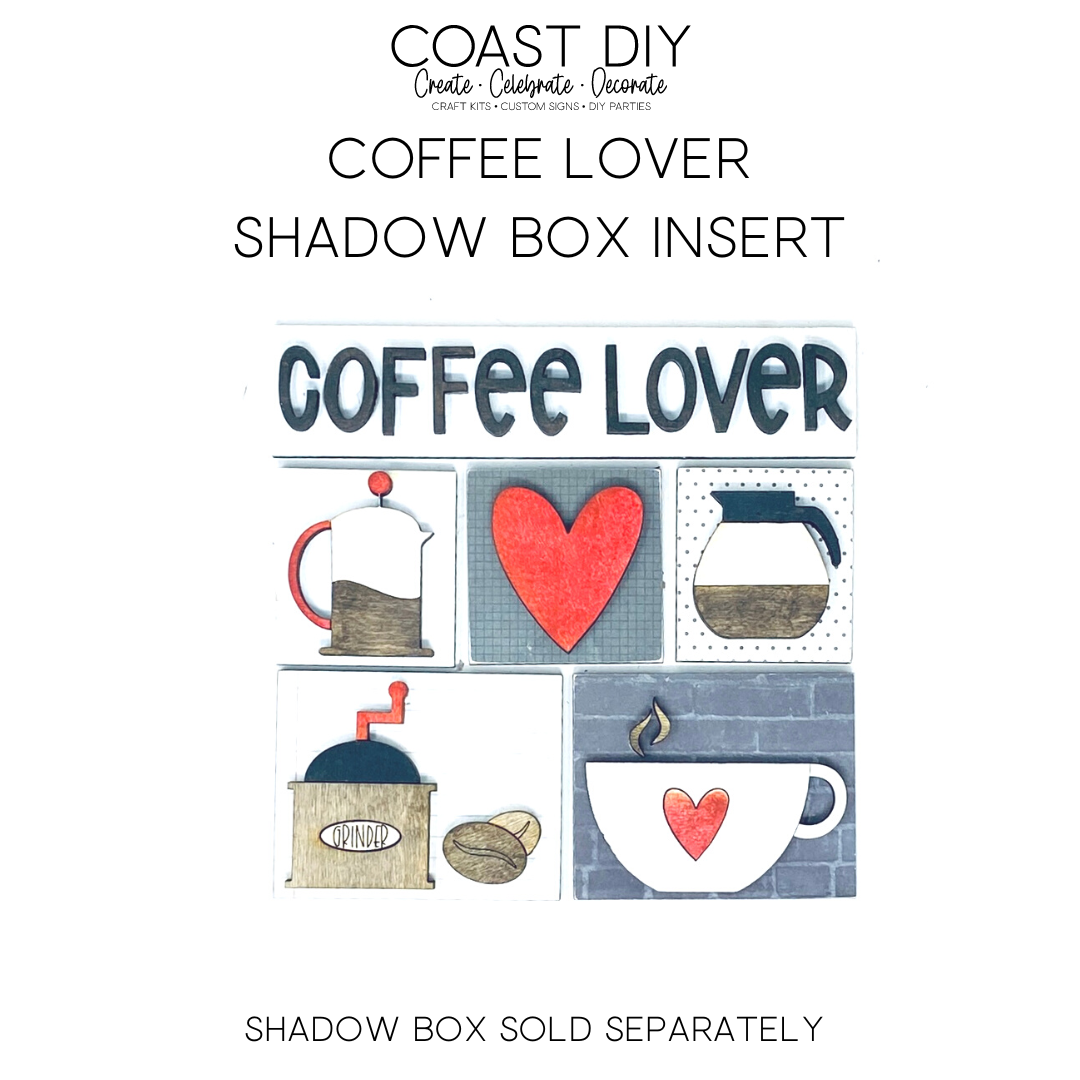 This listing is for the Coffee Lover Shadow Box Insert. You get 6 different insert backgrounds and designs with this kit including: French press, heart, coffee pot, grinder and cup. You also get the word "Coffee Lover". The inserts are designed to fit the Interchangeable Shadow Box (sold separately) that is 7" square. These inserts vary in size to fit that box.