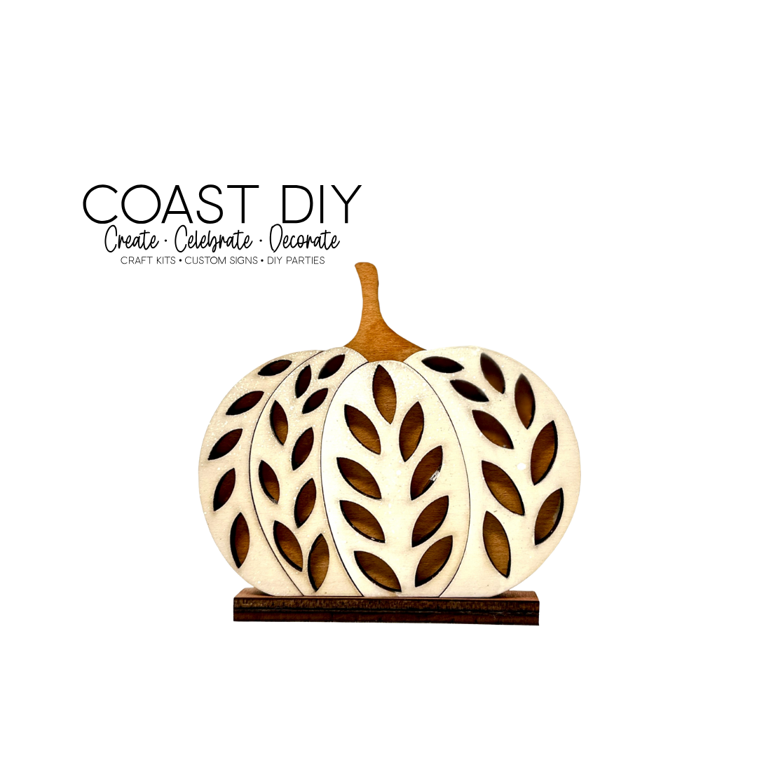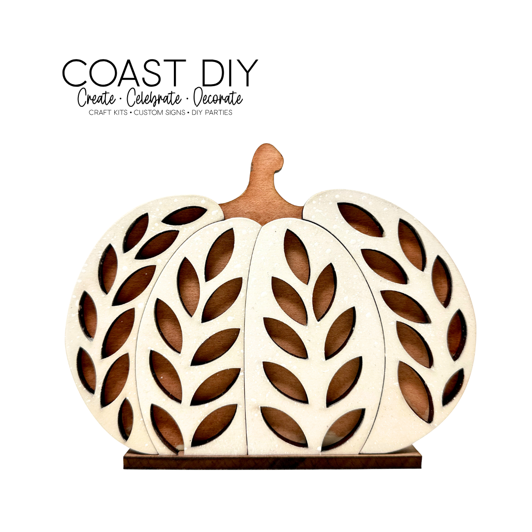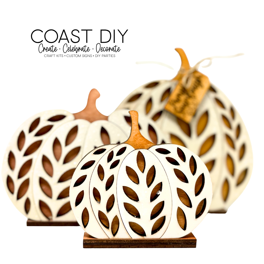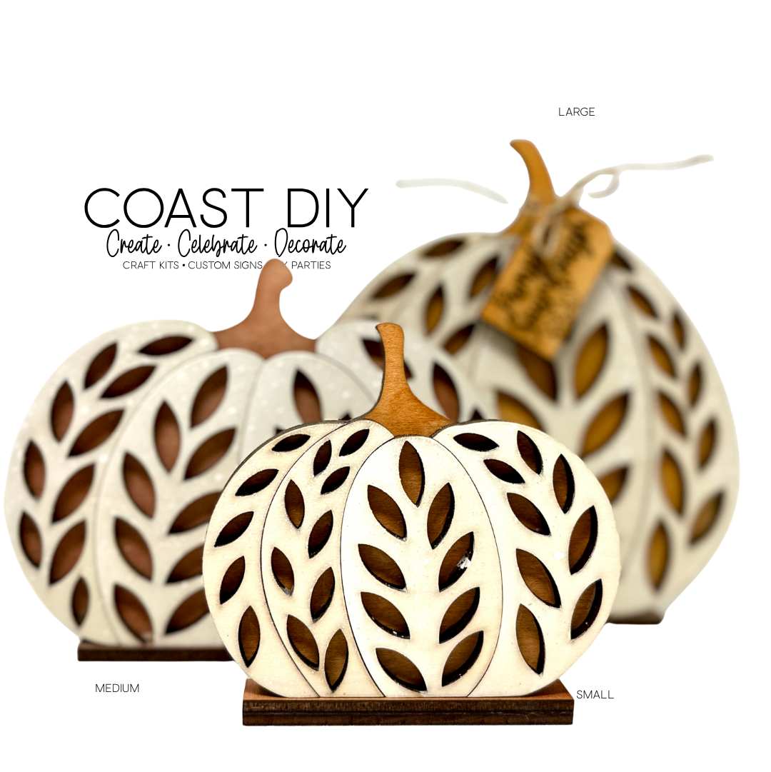 Large is 7" tall, medium is 5" and the small is just over 4" tall. Each are made of 1/4" maple plywood and perfect for stain or paint to finish them off. I used the Thanksgiving stain kit, but you can use anything you'd like. The large pumpkin also comes with the Sourdough Pumpkin tag.