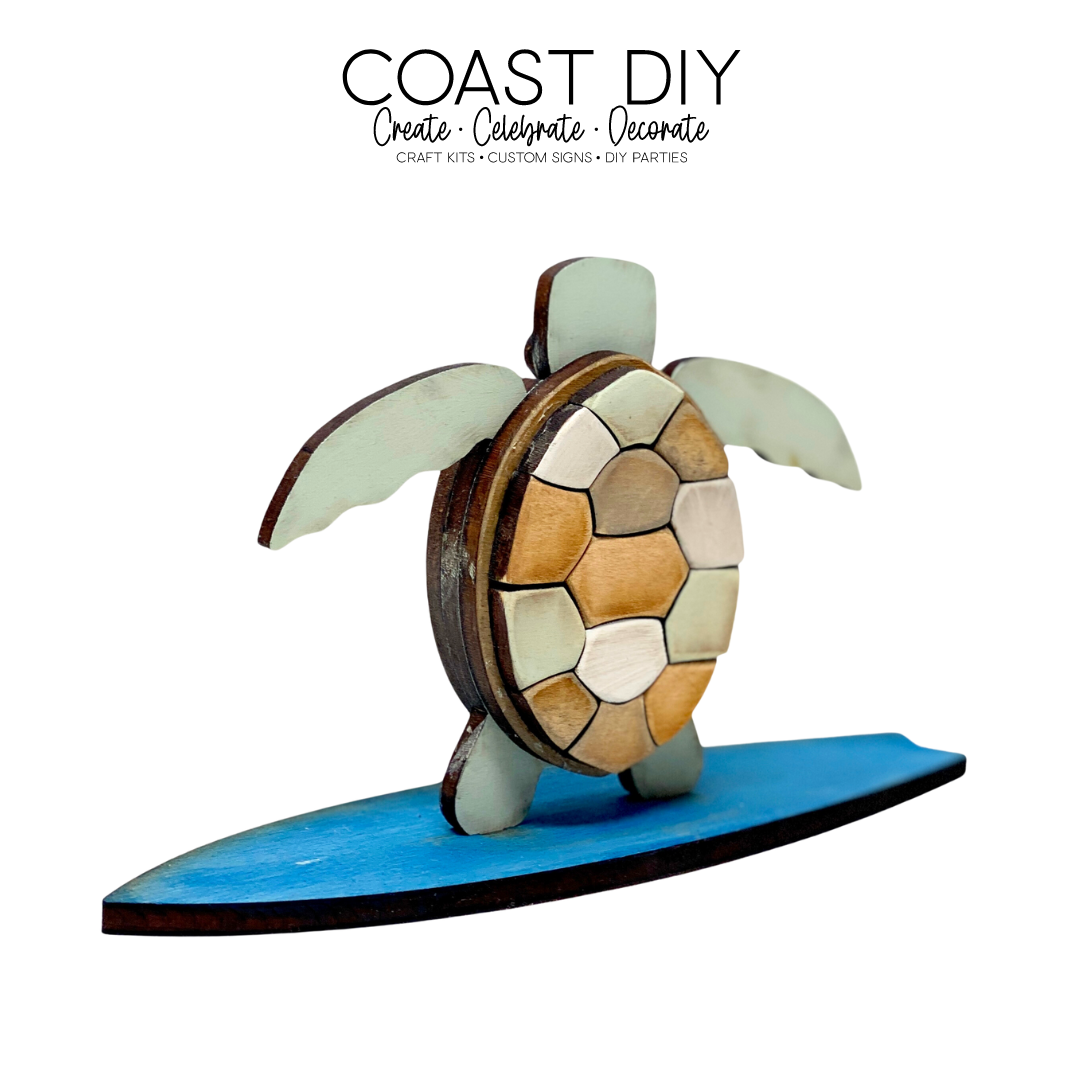 This is the cutest kit! A surfing sea turtle! The turtle is 4 layers to get a ton of dimension. The top shell is cut into pieces so you can paint it all separate easily. Once all together, he stands up on his surfboard. I've paired him with the Seaside Village Surf Shop sold separately.