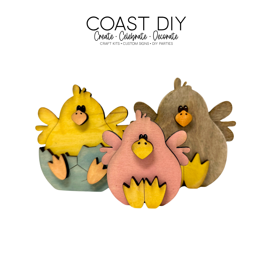These cuties are super fun for spring. You get three chicks, one in an egg. The tallest is 4" and the smallest is 2.75". They are 3 layers when counting the feet so they stand on their own. Tuck them all over your house.