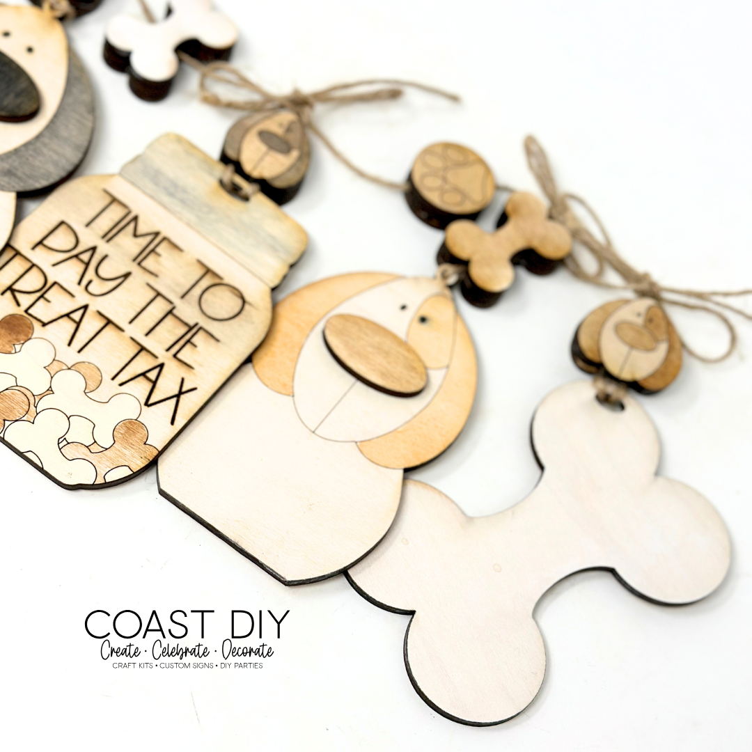 For the dog lovers! You get 5 different 4-5" ornaments including two dogs, a bone, a paw and a treat jar. You also will get 7 layered wood beads that you can use with the ornaments or separately. These would make a cute garland or make cute gift tags.