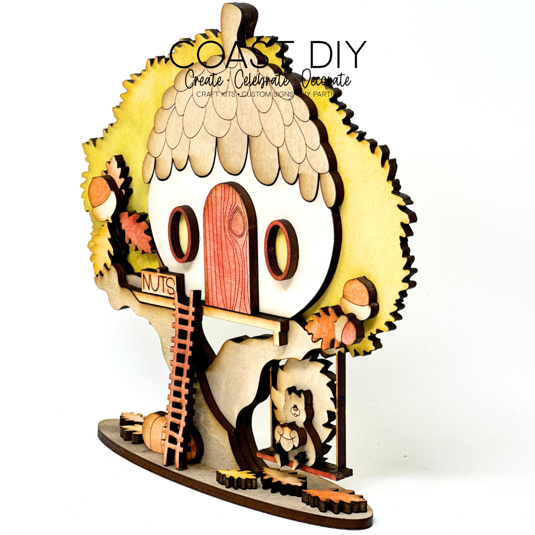 This one is precious with the acorn shaped tree house, the squirrel is on his swing and there is an old ladder.